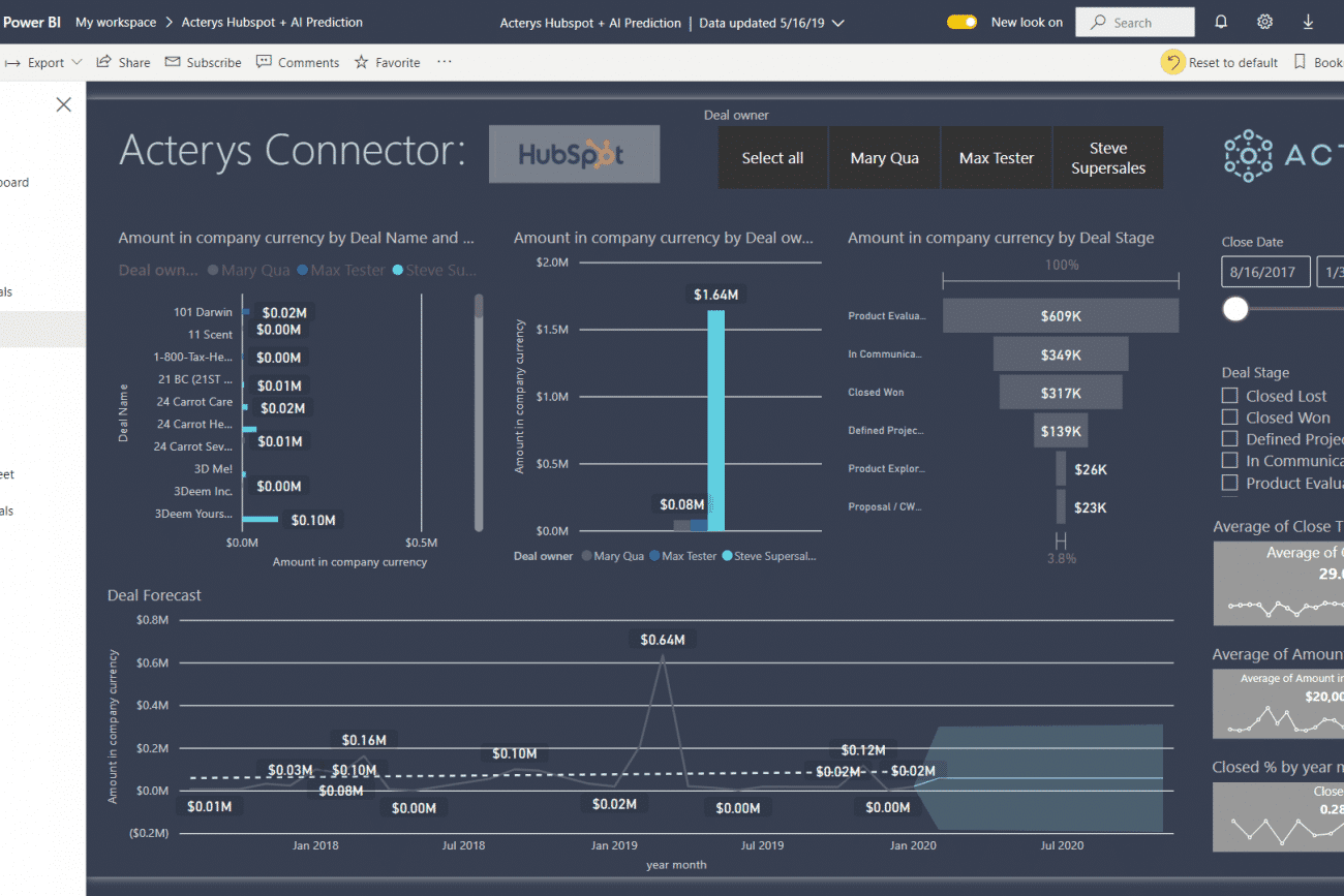 La infraestructura virtualizada local y en la nube de Acterys le permite consolidar los datos de HubSpot junto con otras fuentes para obtener una única fuente de verdad que potencie sus decisiones de planificación. Aproveche la integración bidireccional para configurar Power BI o Excel como su interfaz principal de informes para leer y escribir informes o cuadros de mando totalmente personalizables.