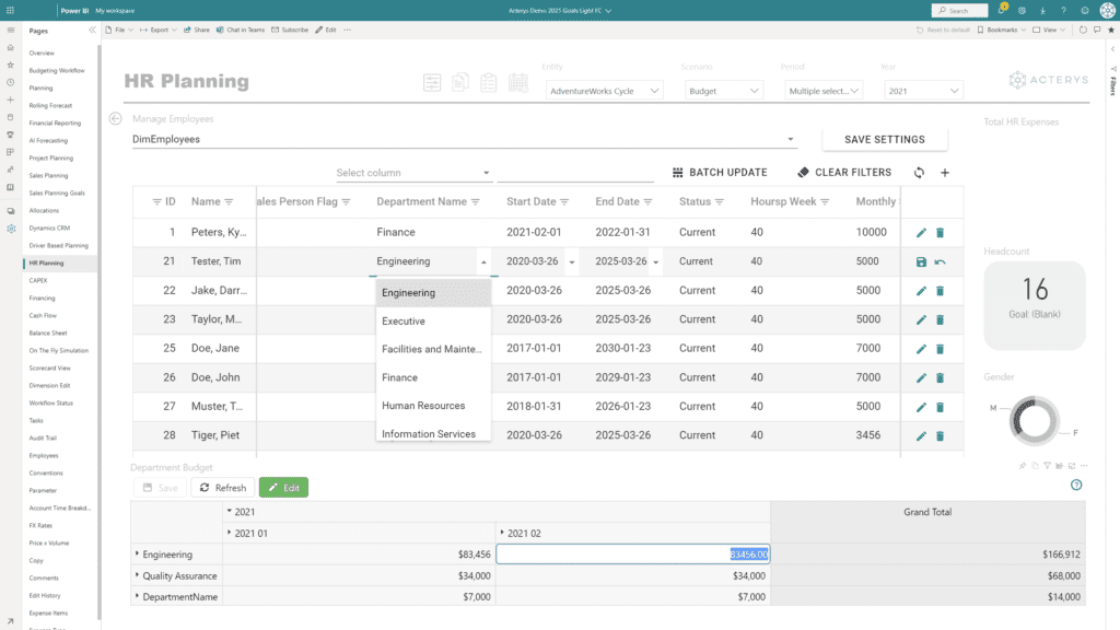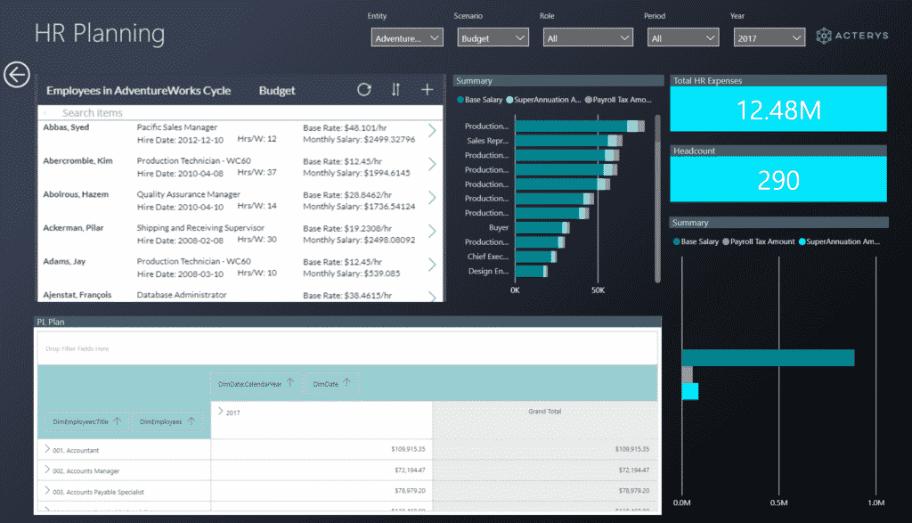 La planificación de la fuerza laboral es el proceso de pronosticar las necesidades futuras de recursos humanos y garantizar que existan los planes y recursos necesarios para satisfacer esas necesidades. Acterys ofrece herramientas de planificación de la fuerza laboral que ayudan a empresas de todos los tamaños a pronosticar sus necesidades futuras de recursos humanos e identificar posibles brechas en su fuerza laboral. Estas herramientas ofrecen informes detallados de los empleados, análisis de recursos humanos mejorados y pronósticos de productividad. Al utilizar estas herramientas, las empresas pueden asegurarse de tener la cantidad de empleados con las habilidades adecuadas para satisfacer sus necesidades futuras.